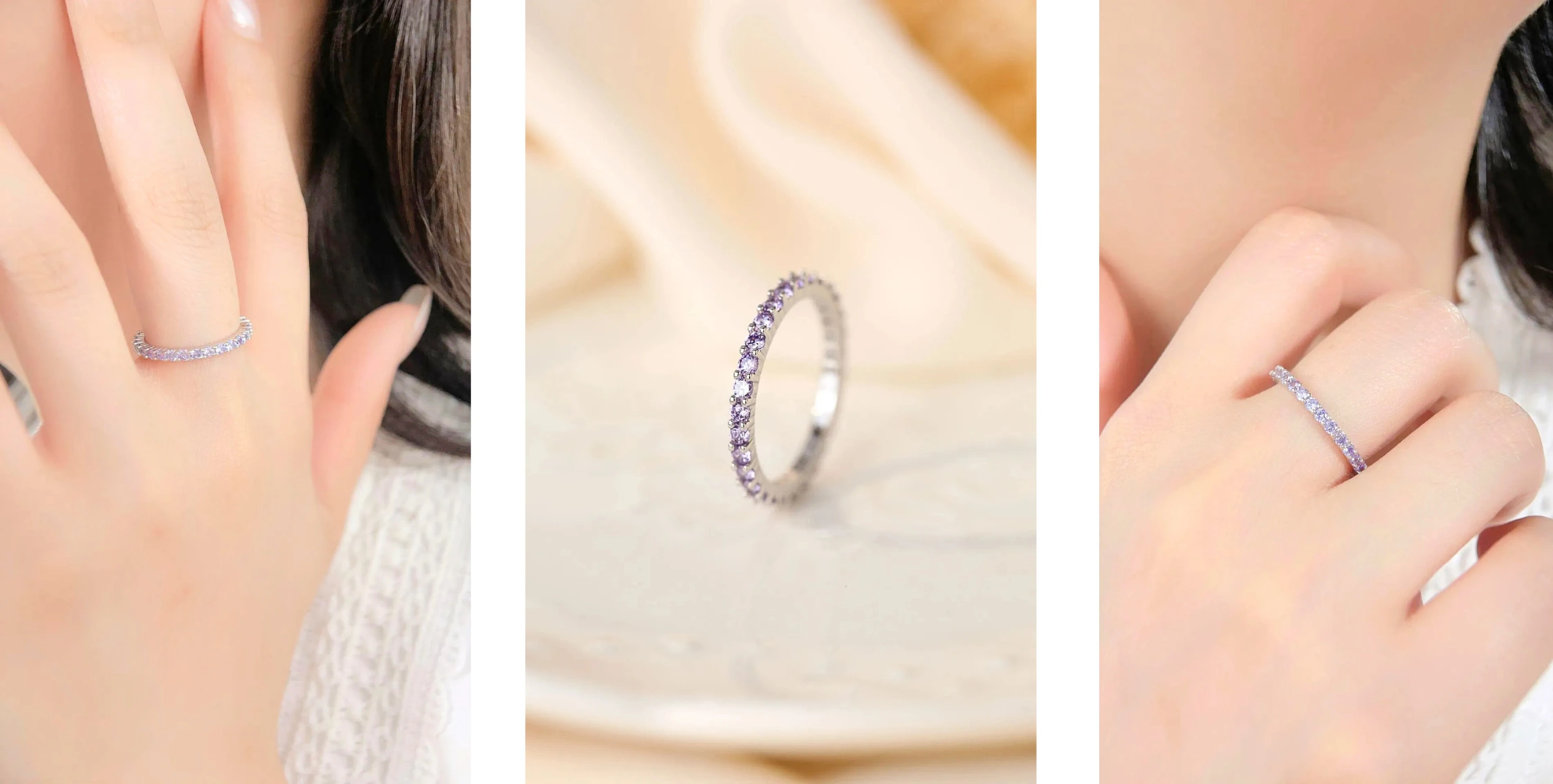 • Un diseño elegante que resalta la magnificencia natural de la amatista y se armoniza con la pureza de la plata.